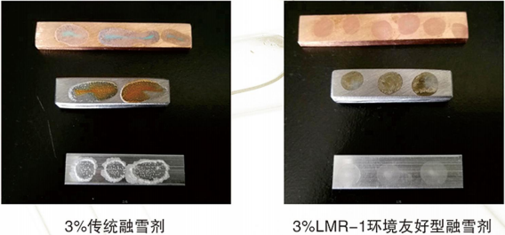 3、防腐性能好,采用M3超膜防銹技術(shù),對(duì)碳鋼、銅、鋁合金等金屬幾乎不腐蝕;對(duì)瀝青、混凝土路面腐蝕小。LMR-1融雪劑防銹性能見下圖。