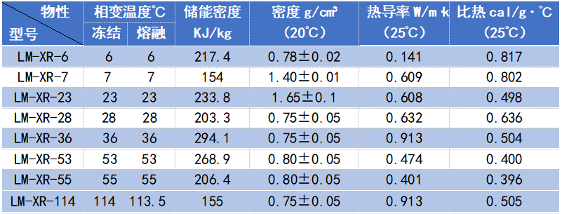 LM-XR系列產(chǎn)品由主儲能劑、相變調(diào)整劑、防過冷劑、防相分離劑、誘發(fā)劑等多組分復(fù)合制備而成。本品通過固-液-固相態(tài)變化實現(xiàn)熱能的儲存和釋放,具有較高的儲能密度及合適的比熱和導(dǎo)熱系數(shù)。本品不易揮發(fā)、安全可靠,可以反復(fù)使用。